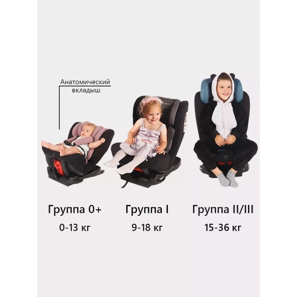 - Группа 0+/1/2/3, 0-36 кг (с рождения до 18 кг 0+/1; от 9 кг до 36 кг 1/2/3; от 15 кг до 36 кг 2/3)