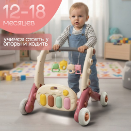 В одном устройстве объединены: устойчивые ходунки, съёмная музыкальная панель, мягкий коврик и подвесные игрушки.