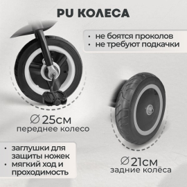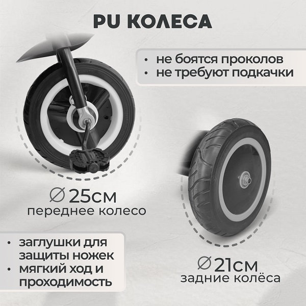 - Колеса полиуретановые с интегрированными подшипниками, поэтому малыша не будет трясти даже по неровным дорогам. Переднее 25 см с переключением педалей на холостой ход, задние 21 сантиметр.