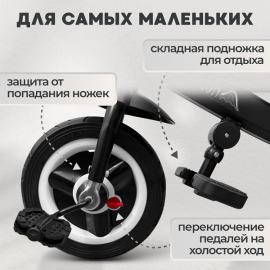 - Переднее колесо: 25 сантиметров с защитой от попадания ножек и переключением педалей на холостой ход