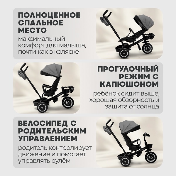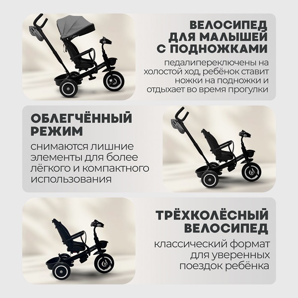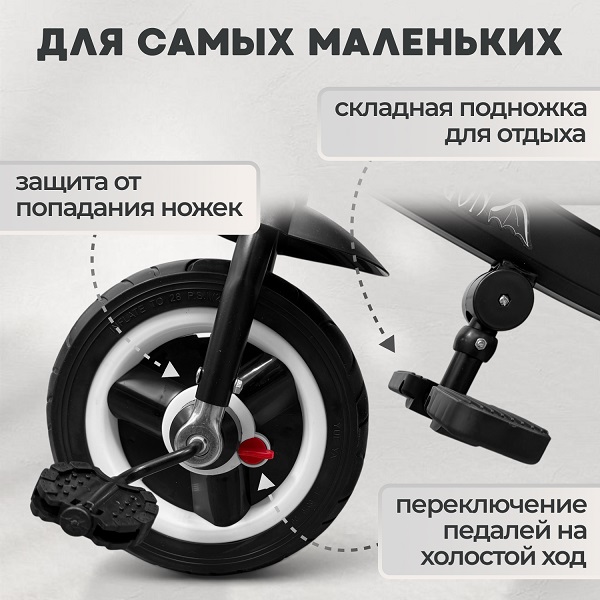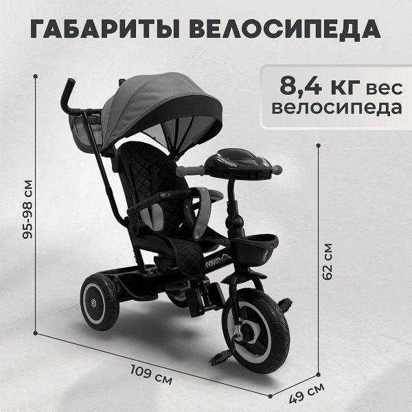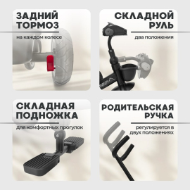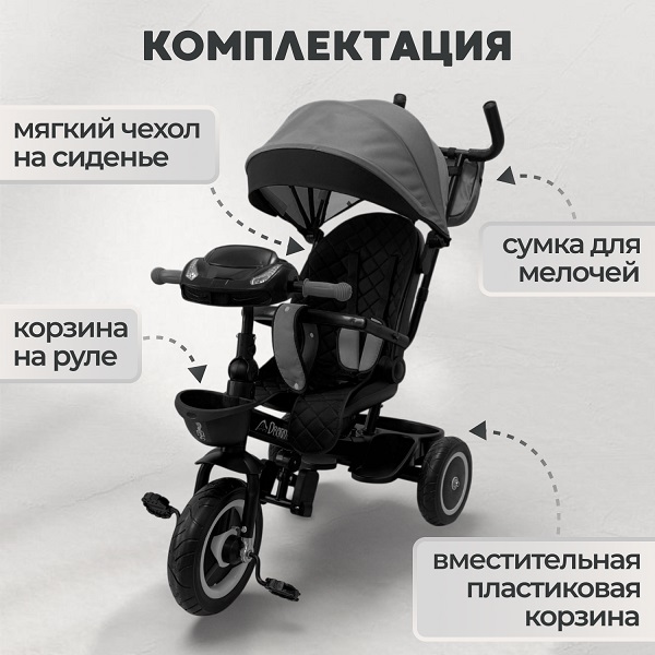 - Комплектация: съемный капюшон, музыкальная панель, сумка для мелочей, багажная корзина, съемные педали, корзинка на руле
