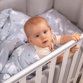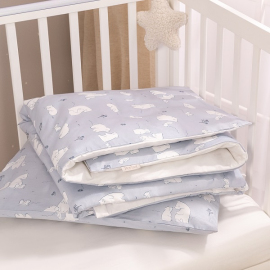 Комплект разработан для стандартных кроваток со спальным местом 120×60 см и включает 3 предмета: простыню на резинке, наволочку и пододеяльник на молнии.