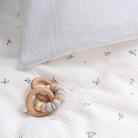 Комплект из 3-х предметов: простыня, наволочка, пододеяльник - подходит для кроваток со спальным местом 120х60 см. Дополнительно можно приобрести муслиновые простыни на резинке разных цветов.