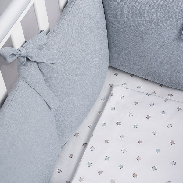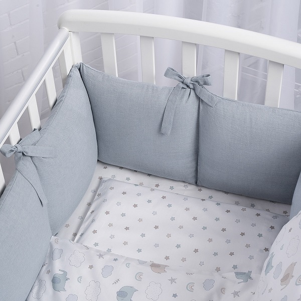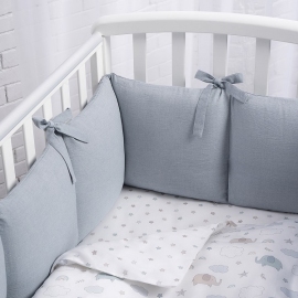 Дополнительно к комплекту можно приобрести бортики из материала Soft Cotton. С лиловой расцветкой комплектов прекрасно сочетаются бортики серо-лилового цвета, а с голубой - бортики голубого цвета.