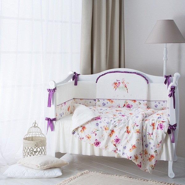 Комплект подходит в стандартную детскую кроватку с размерами 120х60.