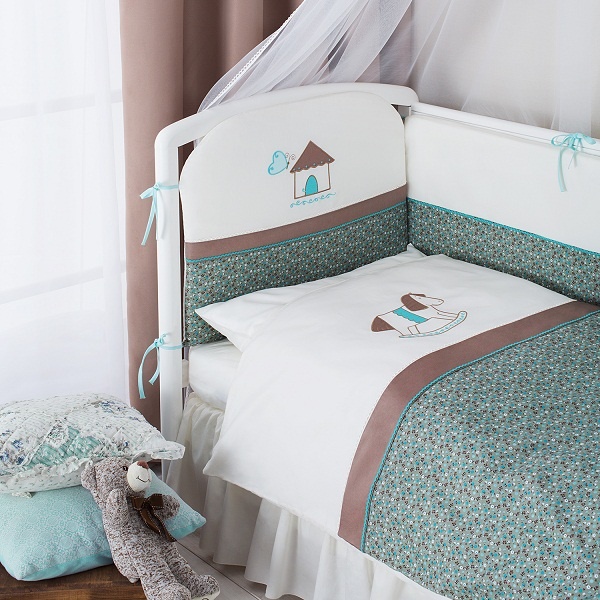 - бампер по всему периметру кроватки создатут ощущения полной безопасности и косфорта. Бампер состоит из 4 частей со съемным чехлом 38х360 см. Для мамы эта характеристика несомненное приемущество в уходе за комплектом