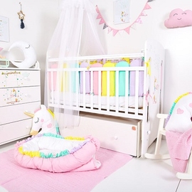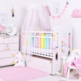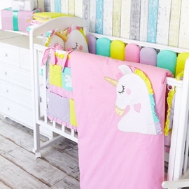 - помимо бортиков-единорогов, в комплект входят два бортика в виде заборчика и 6 бортиков-подушек, отделанных лентой