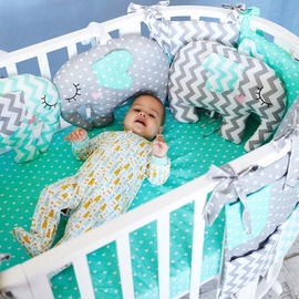 Комплект с универсальной простыней на резинке, подходит для овальной и круглой кроватки. В комплект входят отдельные друг от друга подушки и подушки-игрушки, что позволит вам самостоятельно создать дизайн в кроватке для вашего малыша. На игрушках вышивка с двух сторон, что делает их настоящими мягкими игрушками из абсолютно безопасных материалов. Съемные наволочки только на бортиках-подушках. Игрушки можно стирать в машинке при температуре 30-40 градусов, на небольших оборотах, без сушки и отпаривания. Игрушки наполнены холлофайбером, что позволяет им быстро сохнуть.