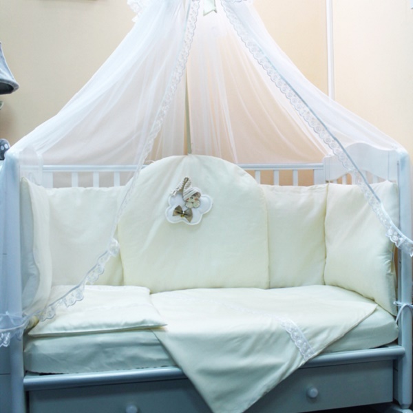 нежный комплект постельного белья, выполненный из струящегося сатина и кружева, станет украшением детской кроватки и подарит немало сказочных снов малышам.
