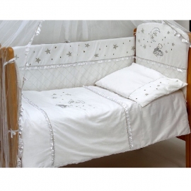 Бортики кроватки и одеяло отделаны мягким бархатным на ощупь велюром и отдекорированы изысканной вышивкой.