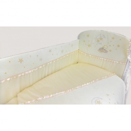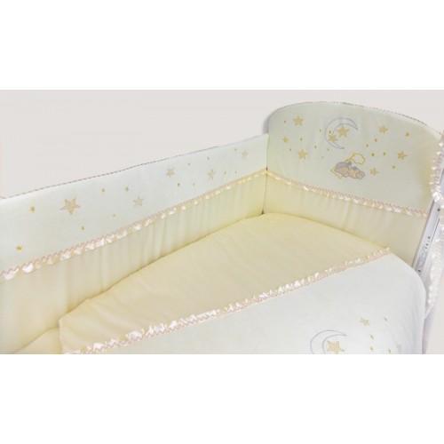 Бортики кроватки и одеяло отделаны мягким бархатным на ощупь велюром и отдекорированы изысканной вышивкой.