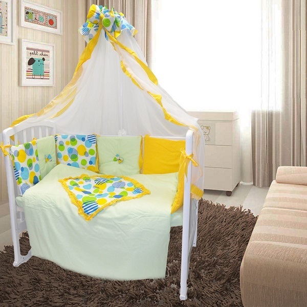 Отличительная особенность - разделение борта на своеобразные подушечки. Комплект украшен нарядными рюшами.
