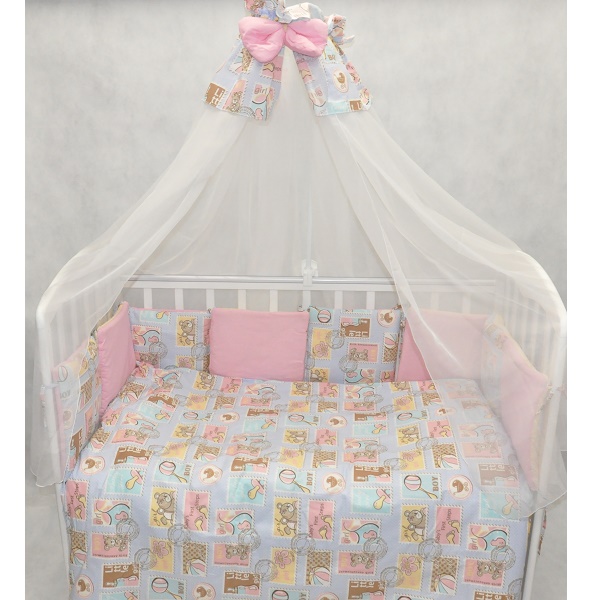 Отличительной особенностью этого комплекта в кроватку является необычный бортик - он разделена на 12 частей. Все чехлы на бампере съемные, что удобно и практично при стирке.