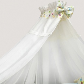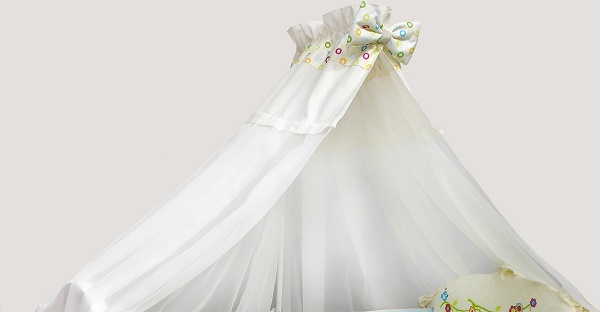 Нежный балдахин, изготовленный из мягкой вуали и отделанный вставкой из ткани и красивым объемным бантом, создаст уют.