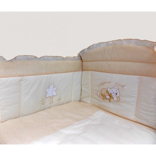 На бортике в изголовье расположился медвежонок с пожеланием сладких снов вашему малышу.