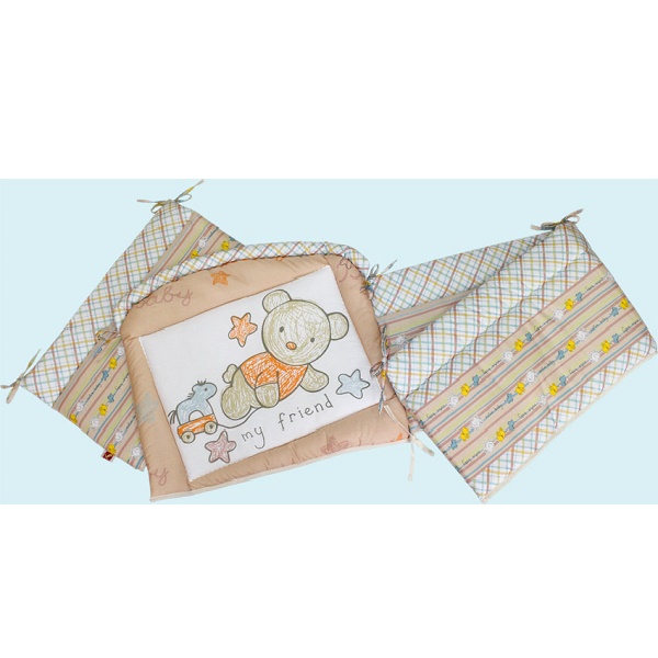- бортик состоит из 4-х частей, которые крепятся по периметру кроватки тонкими завязками ткань в клетку.