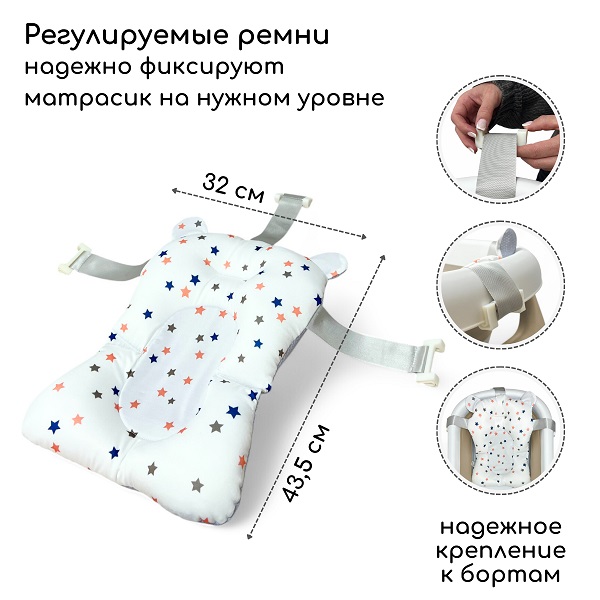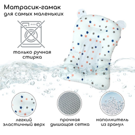 Чтобы обезопасить младенца во время купания в комплекте с ванночкой идет матрасик-гамак, который не тонет в воде и регулируется по глубине погружения. Матрасик-гамак не только помогает поддерживать ребенка на плаву, но и обеспечивает правильное и безопасное положение тела и головы над водой во время купания.