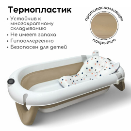 Сама складная ванночка для купания выполнена из прочного и безопасного термопластика, что позволяет ей очень компактно складываться тем самым хранить ее очень удобно, она занимает очень мало места, но при этом в разложенном виде ванночка очень вместительна. Материал устойчив к износу и выдержит тысячи складываний и раскладываний. Также термопластик гипоаллергенен и не пахнет при заполнении горячей водой.