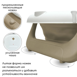 У ванночки для купания малыша прорезиненные ножки, которые не дают возможности скользить ванне как бы сильно ребенок не баловался в воде.