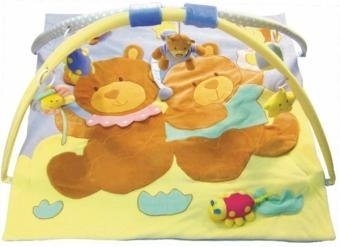 Ткань очень мягкая, разноцветная и приятная на ощупь с интересными изображениями животных. Благодаря своим своиствам, коврик можно располагать на полу, тем самым обеспечивая безопасность ребенка. К дугам подвешены мягкие игрушки. которые можно отсоединять.