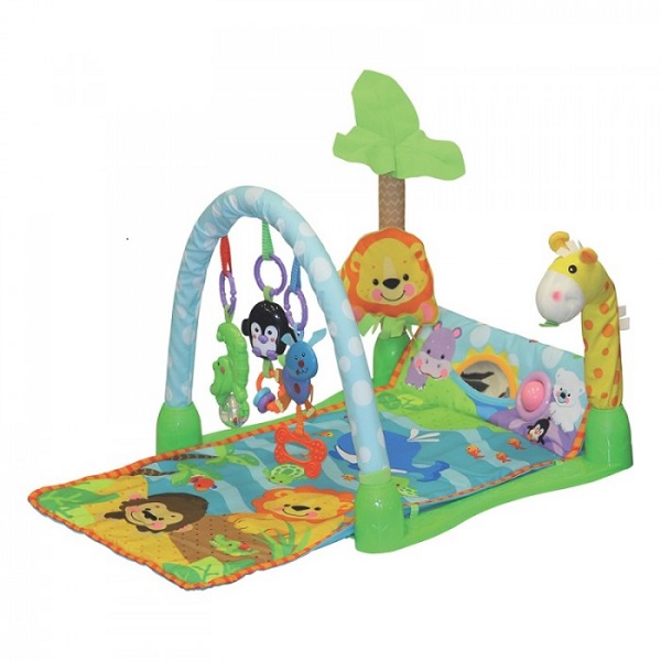 Яркие тона, по краям встроено безопасное зеркало, по периметру размещены игрушки (жираф, льв и пальма), посередине коврика дуга, на которой зафиксированы яркие погремушки и прорезыватель для зубов.