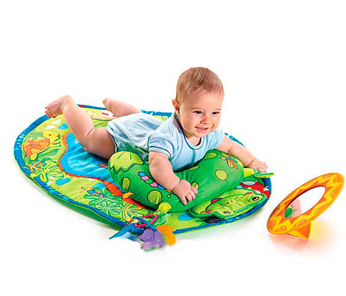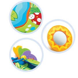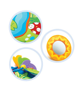 - Здесь есть безопасное зеркало в виде солнышка, благодаря которому ребенок научится держать голову и узнавать себя, мягкая игровая подушечка, на которой малыш сможет лежать, как на животе, так и на спине и погремушка – прорезыватель в форме листиков.