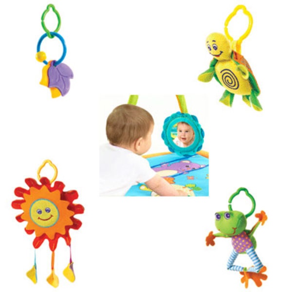 - Яркие и забавные игрушки привлекут внимание малыша, будут стимулировать развитие хватательного рефлекса, когда ребенок будет пытаться дотянутся до них. Лежа на животике, малыш будет стремится подниматься, чтобы увидеть игрушки, картинки и зеркальце, тем самым быстрее научится вставать, сидеть и ползать.