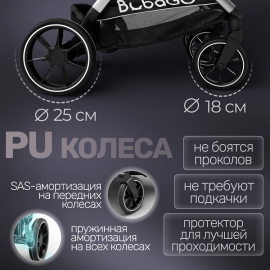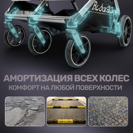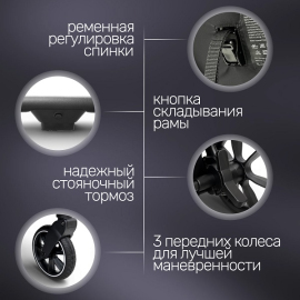 Уникальная конфигурация шасси — три колеса спереди вместо двух — делает коляску более устойчивой и управляемой, особенно на поворотах и неровных поверхностях.