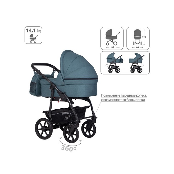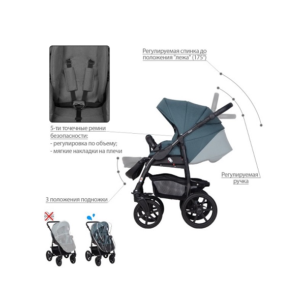 - Обивка коляски: водоотталкивающая, с УФ-защитой.