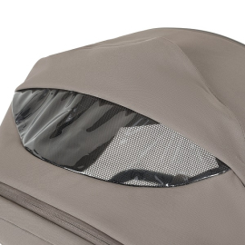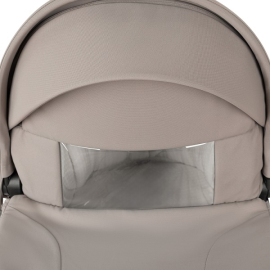 - Капор люльки оборудован ручкой для переноски, имеется съемный козырек, дополнительная секция, климатическое окно под молнией в корпусе люльки и в капюшоне.