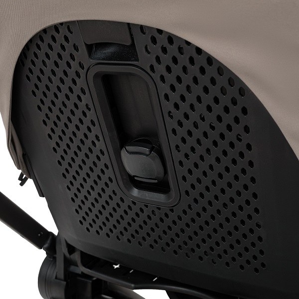 - Капор прогулочного блока изменяет свою высоту, фиксируется в одном из трёх положений (разница между минимальной и максимальной высотой капа – 6 см). Кнопка-фиксатор расположена на внешней стороне спинки. Спинка выполнена из прочного гипоаллергенного пластика, с функцией проветривания. Кап оборудован дополнительной секцией под молнией, позволяющей увеличить его размер, смотровым окошком и съёмным козырьком.