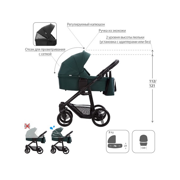 - Для переноски люльки: удобные боковые ручки, ручка на капюшоне.