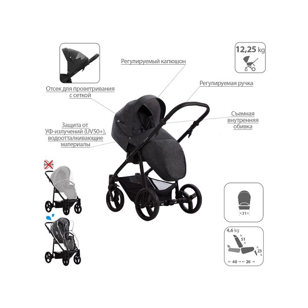 - Обивка коляски: водоотталкивающая, съемная, с УФ-защитой 50+.