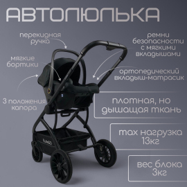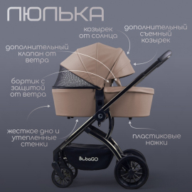 Коляска комплектуется автолюлькой BubaGO, у которой есть переходники для установки на шасси коляски, таким образом вы сможете использовать ее как автолюльку и как дополнительный блок коляски. Очень удобно использовать автолюльку с шасси: благодаря конструкции люльки вы можете перевозить малыша в авто и в коляске, не доставая из автолюльки, просто перемещая ее саму и используя как переноску.