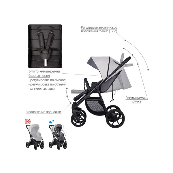 - Регулируемые 5-точечные ремни безопасности с мягкими накладками на плечи.