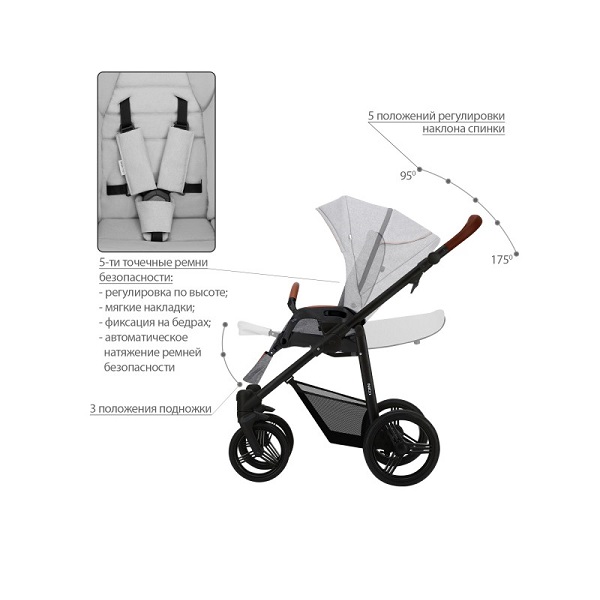 - Регулируемые 5-точечные ремни безопасности с мягкими накладками на плечи.