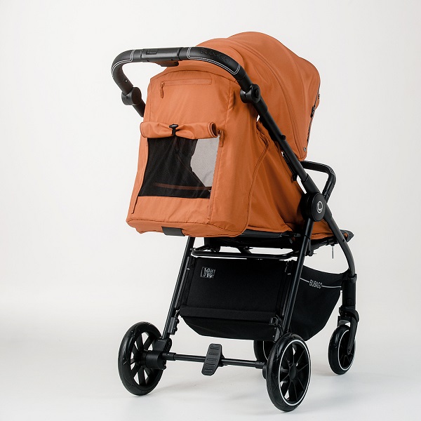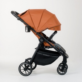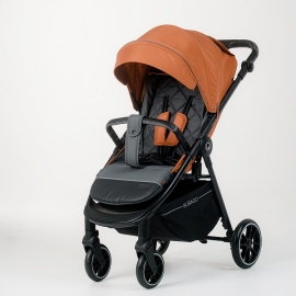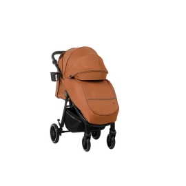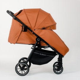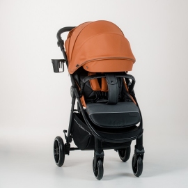 4 больших EVA колеса, пружинная амортизация на каждом – этого более чем достаточно для комфортной езды даже по пересеченной местности, а на дорожках поровнее коляска движется совершенно мягко и беззвучно. При этом коляска небольшая по габаритам, передние колеса поворачиваются на 360° и при необходимости фиксируются на прямой ход - коляска очень маневренная и легкая в управлении. Коляска оснащена удобным и надежным педальным задним тормозом.
