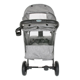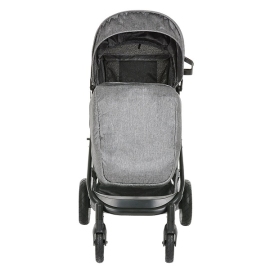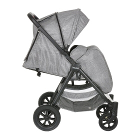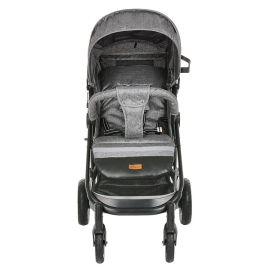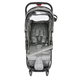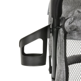 У подножки предусмотрены два положения регулировки. Капор бесшумно регулируется в 3-х положениях, его объем увеличивается благодаря дополнительной секции на молнии, также есть козырек от солнца. В раскрытом состоянии капор практически полностью закрывает верхнюю часть коляски. Коляска отвечает всем требованиям безопасности: 5-ти точечный ремень с мягкими накладками, дополнительной паховой защитой и защитным бампером. В комплектацию коляски входят накидка на ноги и подстаканник.