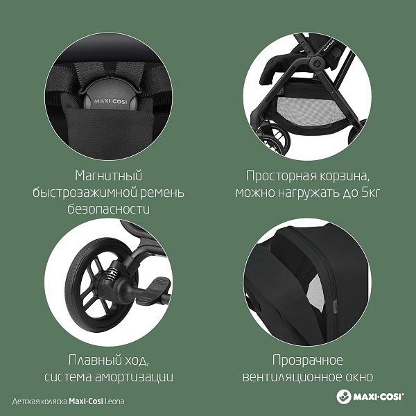 Leona можно использовать с рождения в сочетании с совместимыми люльками (Короб Maxi-Cosi Carrycot Oria) и детскими автокреслами Maxi Cosi.