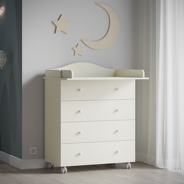 Пеленальная доска с защитными бортиками на комоде съемная, ее легко можно передвигать в любую сторону комода или полностью убрать когда ребенок подрастет.