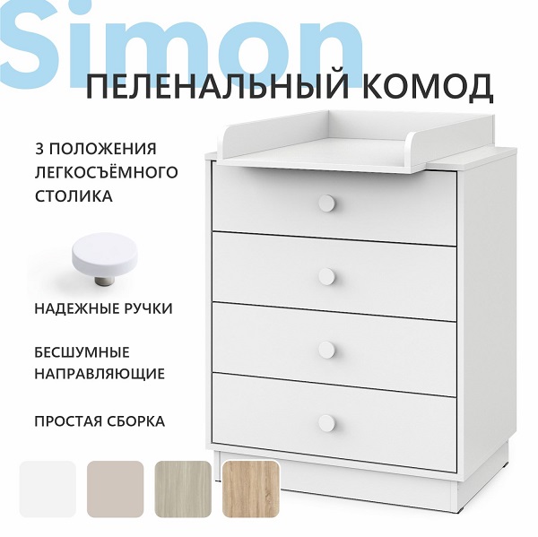 Пеленальный комод Simon шириной 70 см с четырьмя вместительными ящиками.
