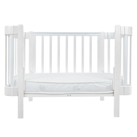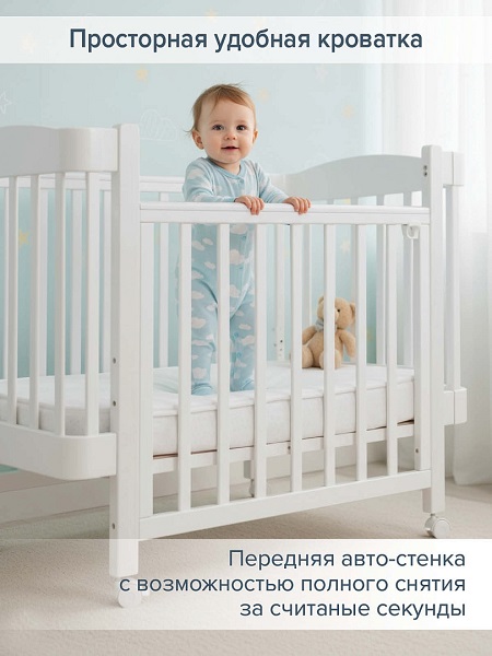 - Передняя авто-стенка с возможностью полного снятия за считаные секунды, для удобного доступа к младенцу.