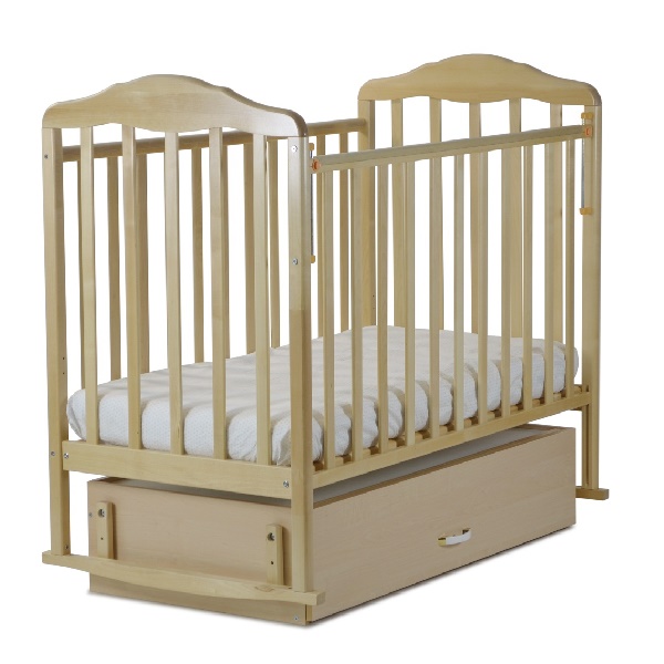 детская кроватка от известного российского производителя SKV-company с практичным и надежным механизмом качания поперечный маятник, выполненная из массива березы, с использованием высококачественных нетоксичных лакокрасочных материалов на водной основе. Оснащена закрытым выдвижным ящиком для хранения детских принадлежностей.