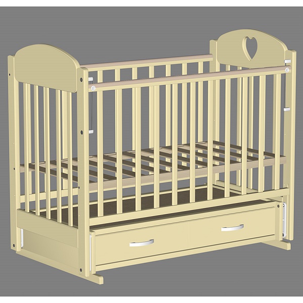 практичная детская кроватка из массива березы с маятниковым механизмом качания и вместительным ящиком для хранения детских принадлежностей. В изголовье кроватки украшение в виде сердечка.