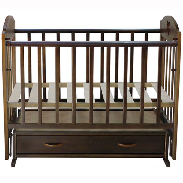 практичная детская кроватка из массива березы с маятниковым механизмом качания и вместительным ящиком для хранения детских принадлежностей. В изголовье кроватки украшение в виде сердечка.