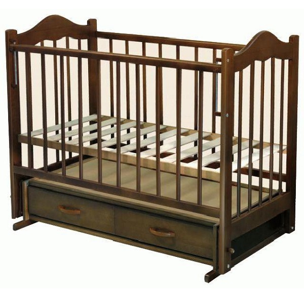 практичная детская кроватка из массива березы с маятниковым механизмом качания и вместительным ящиком для хранения детских принадлежностей. Кроватка Ведрусс Кира 4 имеет изящное изголовье, благодяря планым изогнутым формам контура.