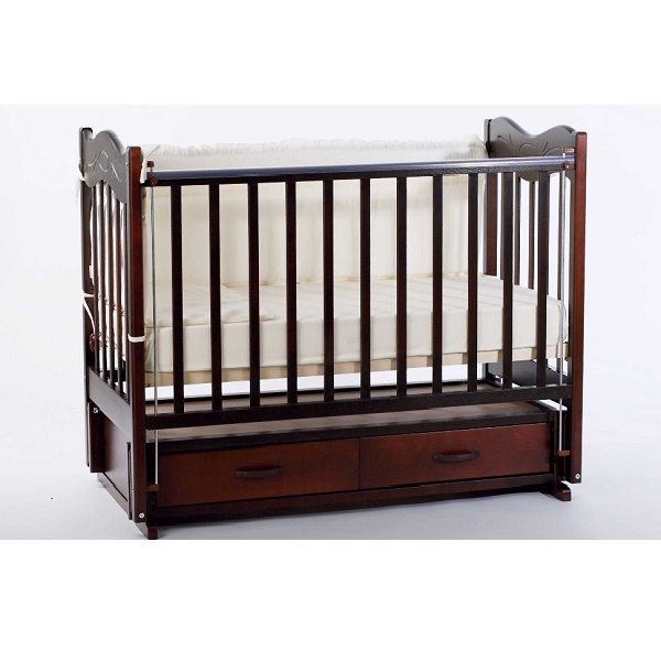практичная детская кроватка из массива березы с маятниковым механизмом качания и вместительным ящиком для хранения детских принадлежностей. Кроватка Ведрусс Кира 4 имеет изящное изголовье, благодяря планым изогнутым формам контура.