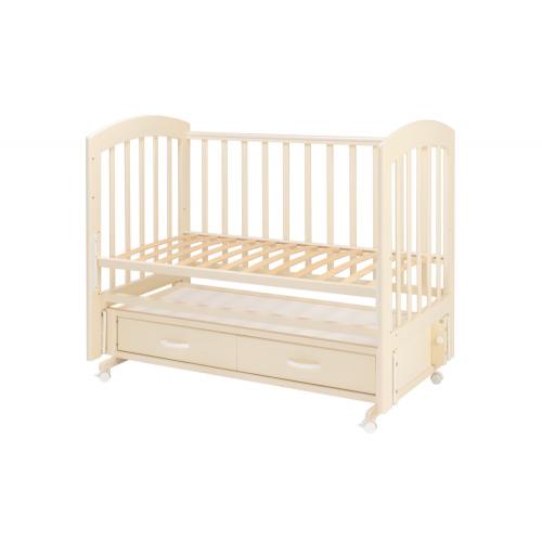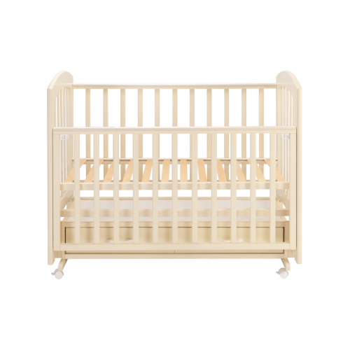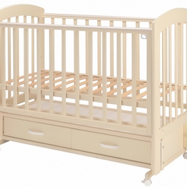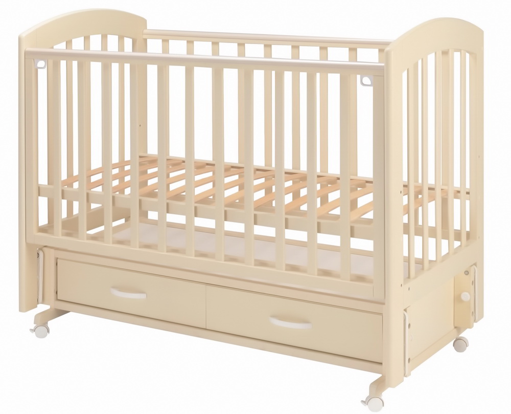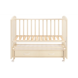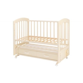 практичная детская кроватка из массива березы с универсальным маятниковым механизмом качания и вместительным ящиком для хранения детских принадлежностей.