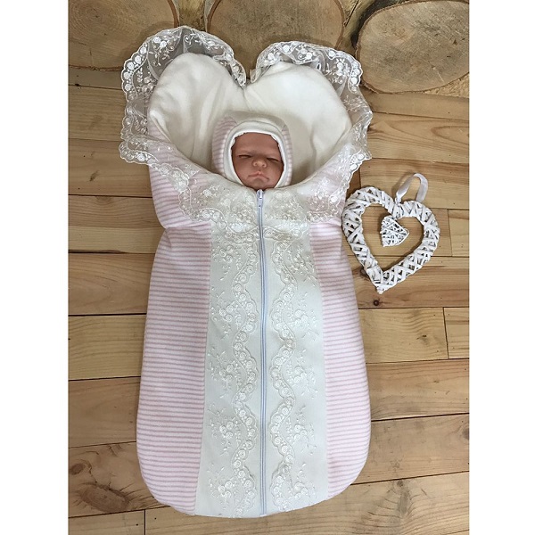 Конверт-трансформер: верх конверта с помощью пуговиц может открываться, либо становиться капюшоном. Кружево используемое в отделке может быть как узким, так и широким - на усмотрение производителя.
