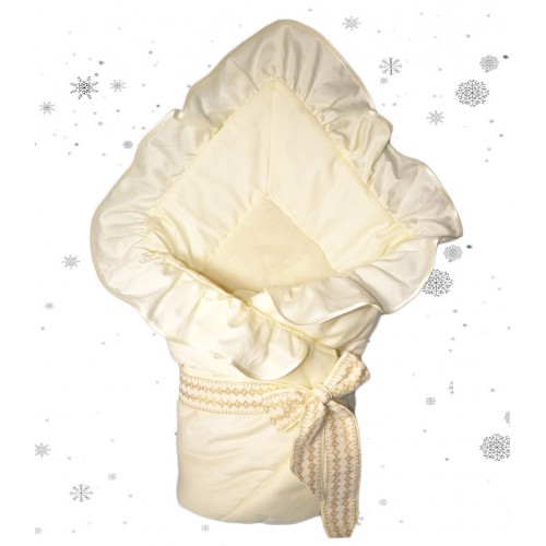 - Конверт трансформируется в одеяло размером 90*90, закрепляется при помощи банта в тон конверта с золотым кружевом.